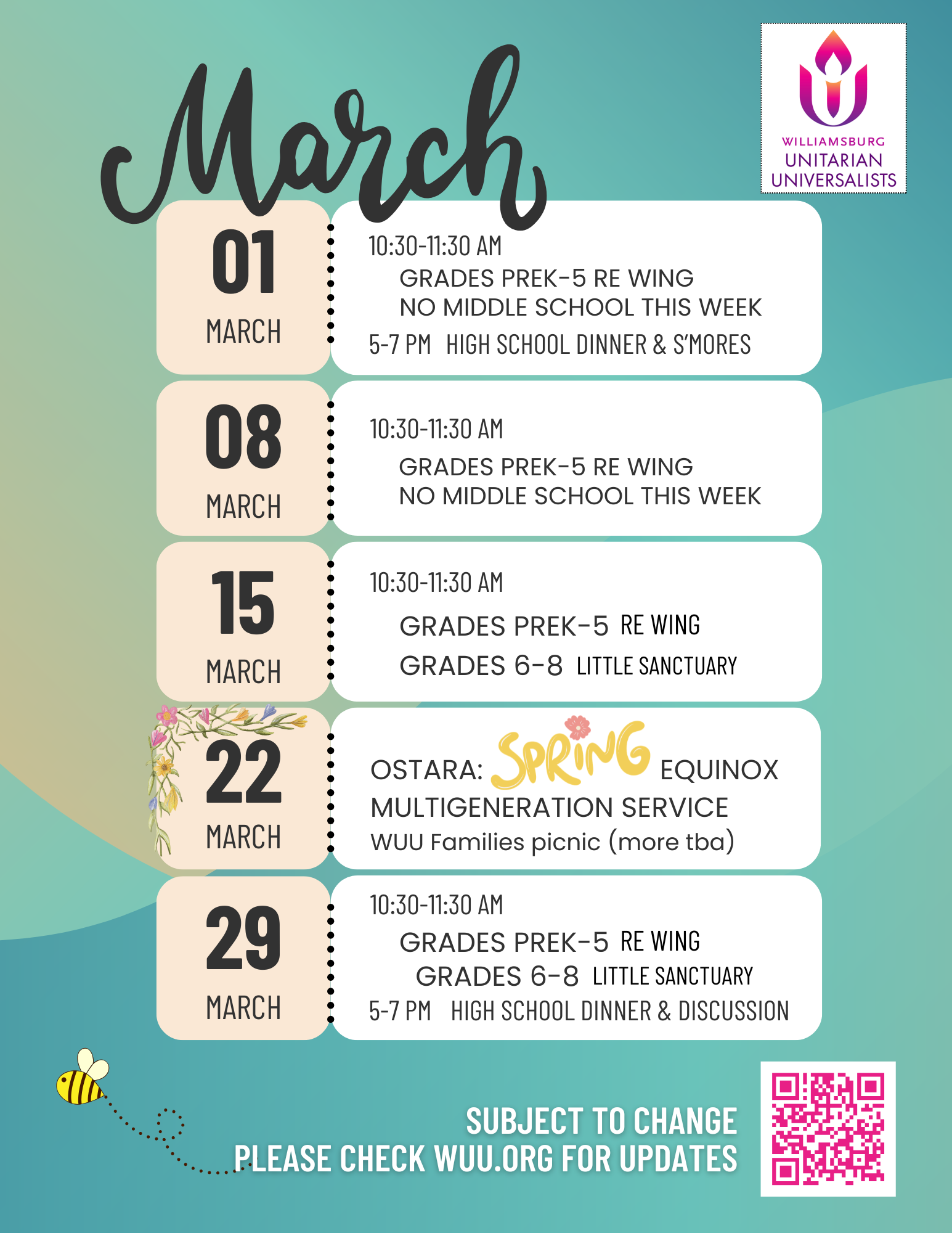 March is filling up fast and Spring is just around the corner. Can you feel it? We can! Religious Education has had a burst of new energy and fun while we look forward to all March has to offer us at WUU!