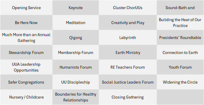 This is an all-day event, beginning with coffee and check-in at 8 AM, worship, workshops, and a closing ceremony. All ages are invited to attend. Childcare will be available upon request. Continental breakfast and lunch are included in the registration fee. Middle and High School youth are invited to register individually for the Gathering and sign up for workshops they would like to attend. There will be a Youth Forum specifically for them during the second session. There is no registration fee for youth and children 18 and under. Please contact Robin Wootton (dre@wuu.org) for more information about opportunities for youth and children at the Cluster Gathering.